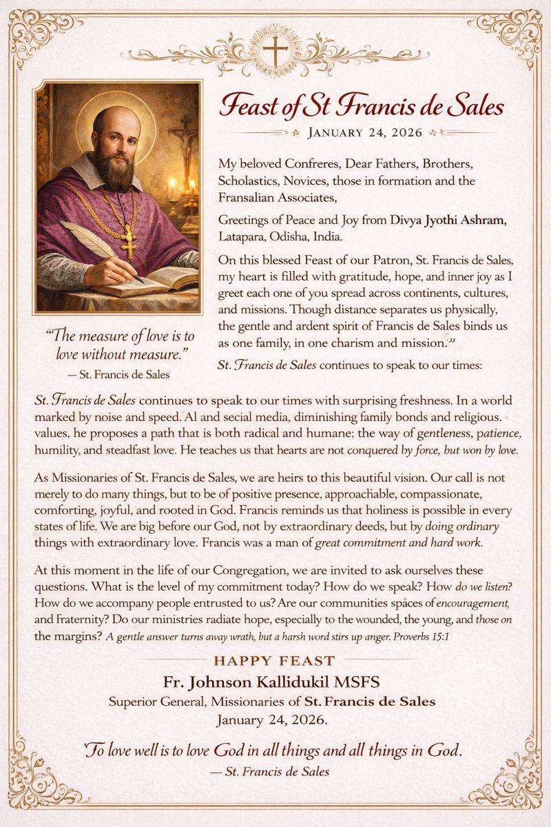 My beloved Confreres, Dear Fathers, Brothers, Scholastics, Novices, those in formation and the Fransalian Associates, Greetings of Peace and Joy from Divya Jyothi Ashram, Latapara, Odisha, India. On this blessed Feast of our Patron, St. Francis de Sales, my heart is filled with gratitude, hope, and inner joy as I greet each one of you spread across continents, cultures, and missions. Though distance separates us physically, the gentle and ardent spirit of Francis de Sales binds us "The measure of love is to as one family, in one charism and mission." love without measure." St. Francis de Sales continues to speak to our times: